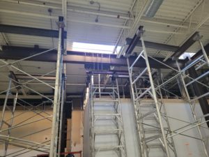 Shoring is adding temporary structural support to the existing roof ahead of new columns and steel spans, girders and joists. When the roof structure is completed, the shoring is no longer required and is removed.